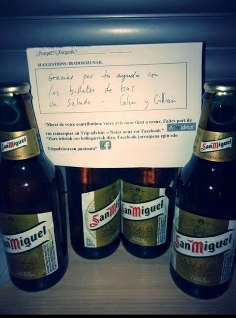 Nos han regalos unas pastas de té y unas cervezas, no podemos estar mas contentos, para nosotros estos detalles nos emocionan ya que consideramos que es una forma de saber que nuestros clientes se han sentido como en su casa y que en su próxima visita a San Sebastian- Donostia nos volverán a elegir y no hay cosas que nos emocione mas: saber que estamos realizando bien nuestros trabajo